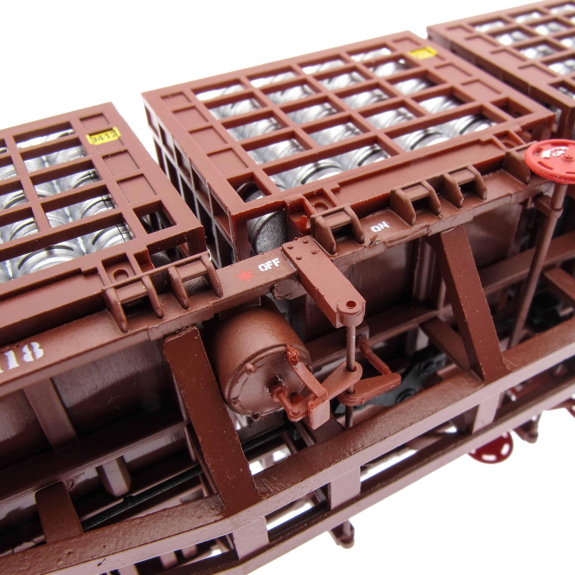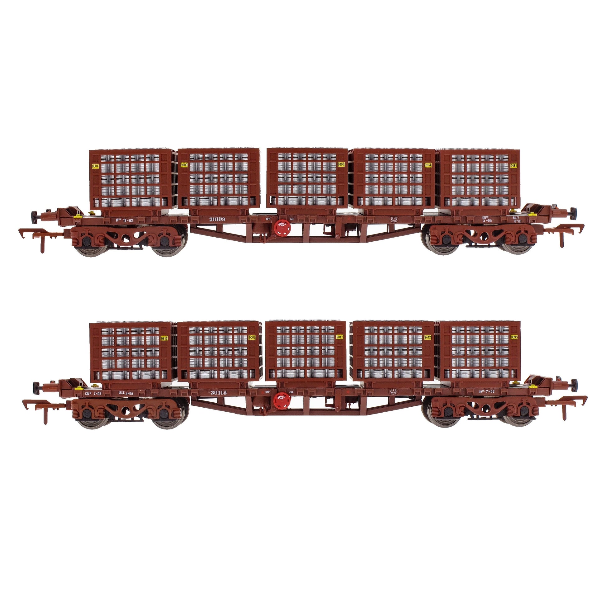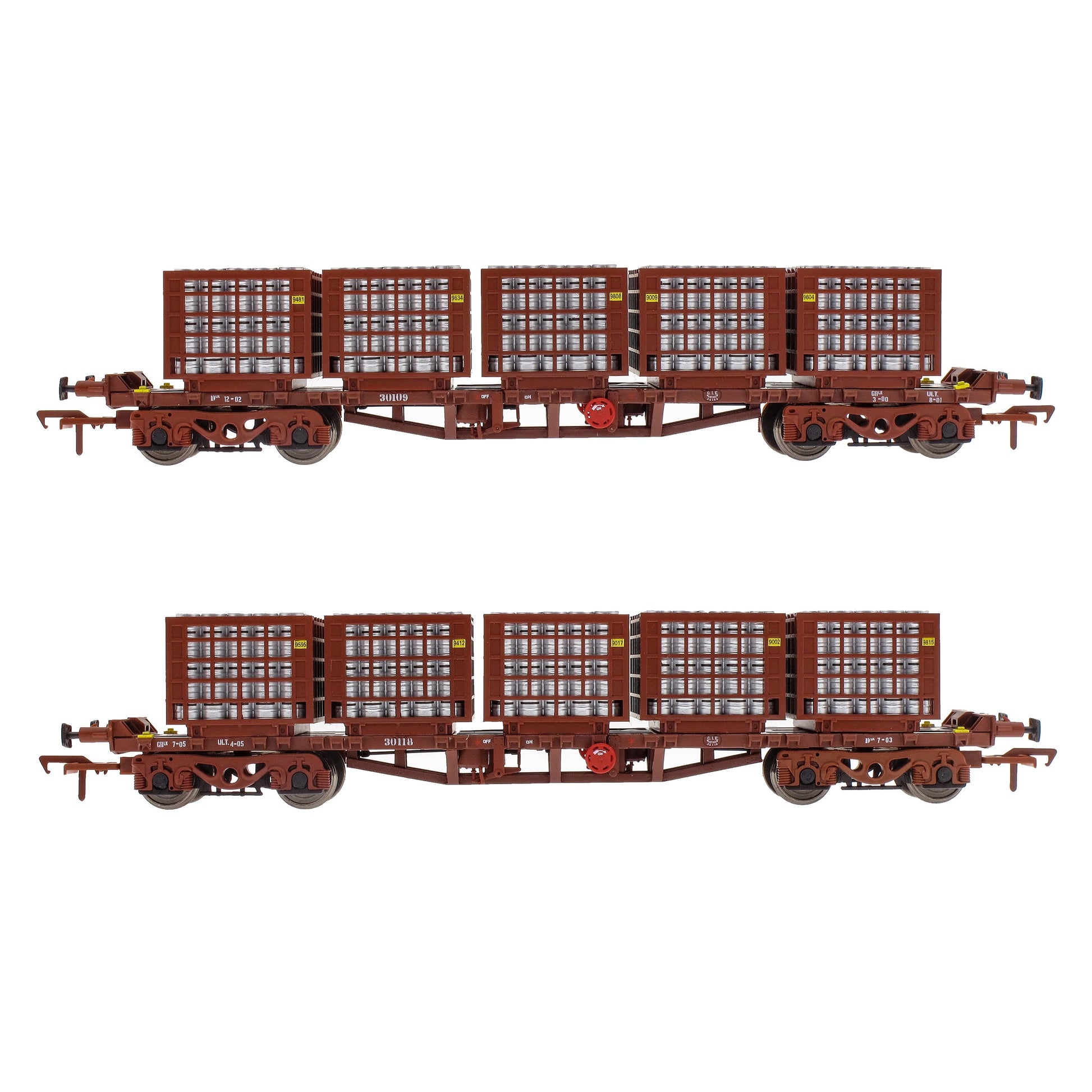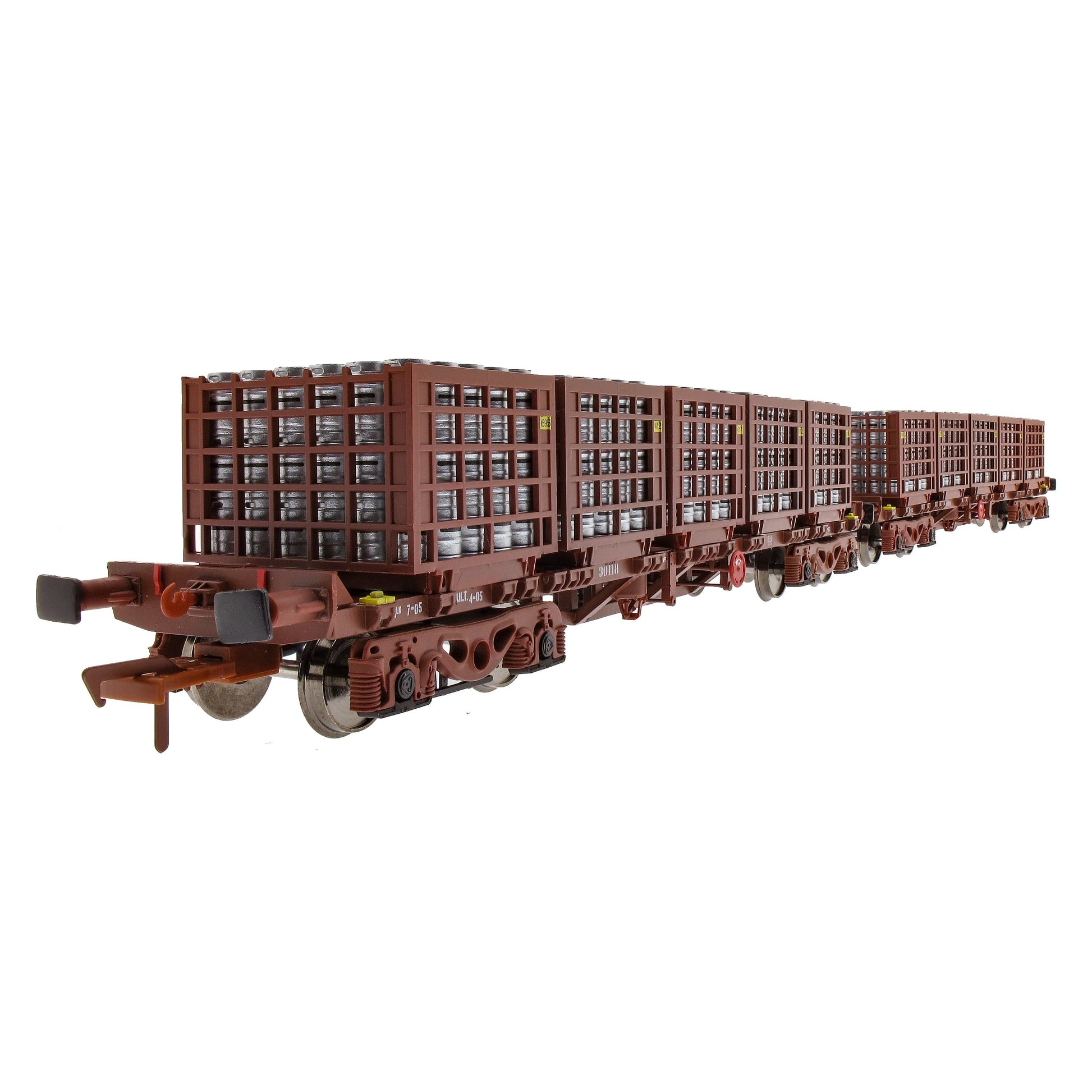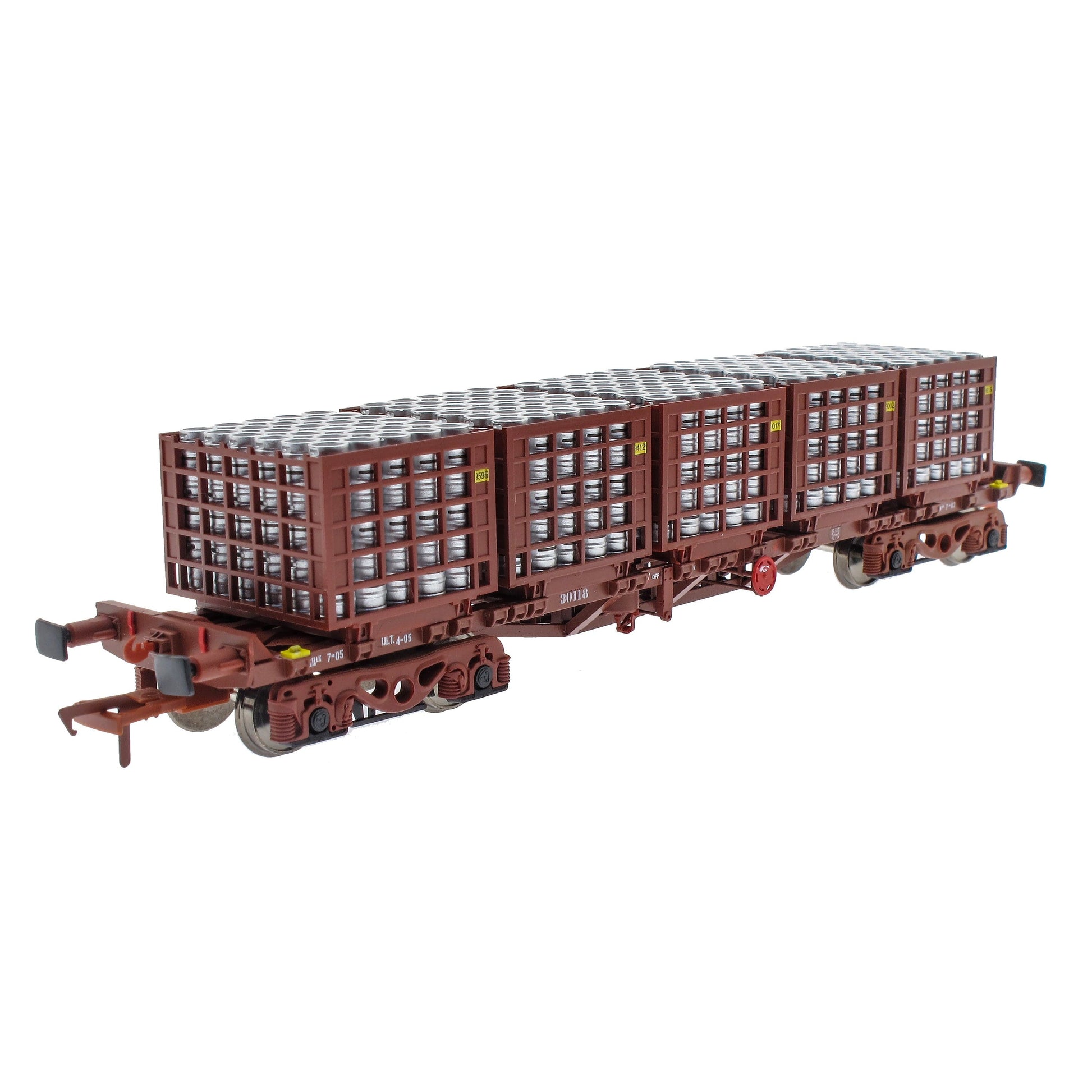 Pack A contains wagons 30188 and 30109 each one loaded with 5, accurate Beer Keg cages, each cage loaded full with silver Beer Kegs.