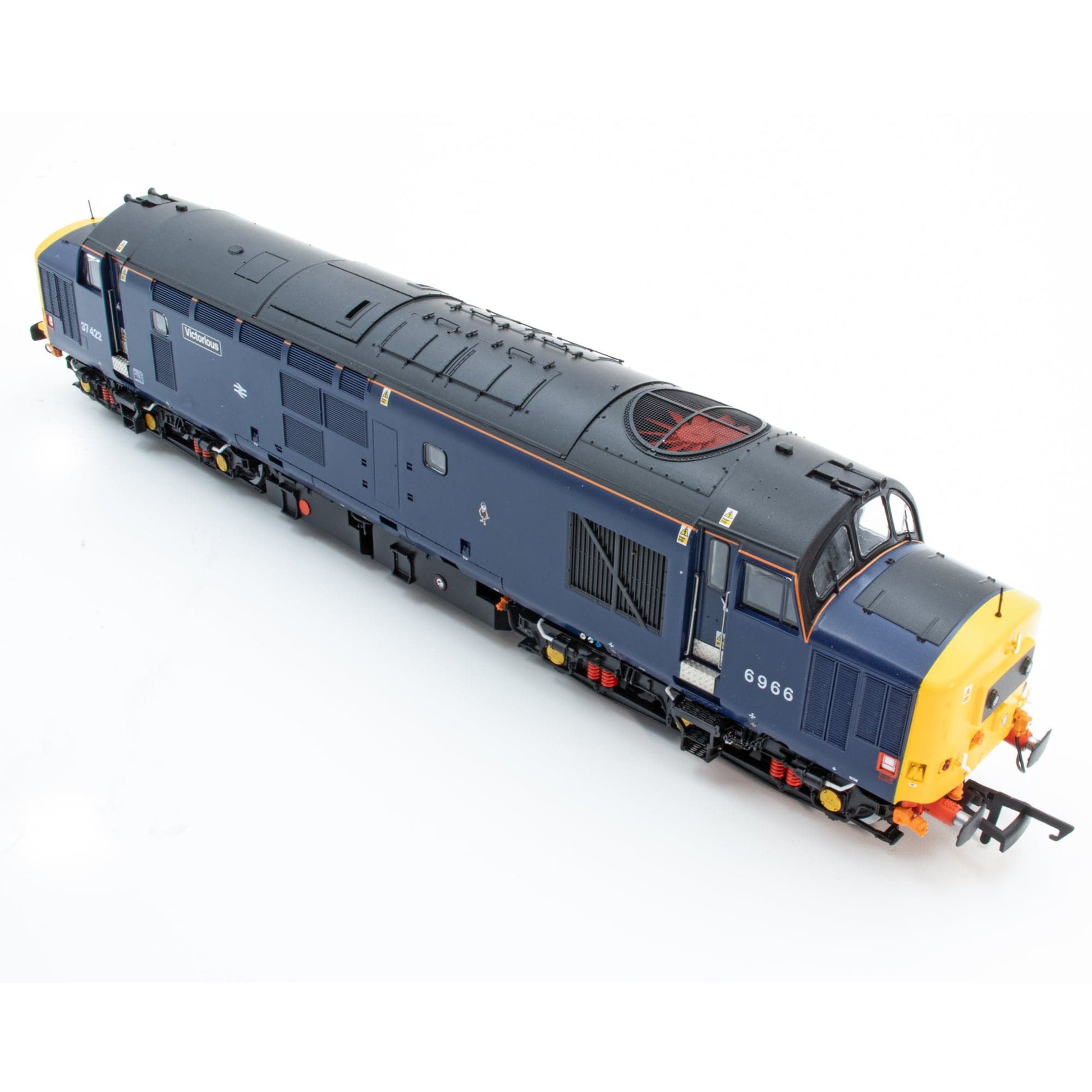 Acquired as part of the mass transfer of Class 37/4s from DB Schenker to Direct Rail Services in 2011, 37422 is unique among the ETS-fitted EEs in having been repainted in the company's dark blue livery but having never received any ownership branding. Reworked for DRS service at Railcare's Glasgow Works with final rectification work undertaken at Barrow Hill, for a long time it looked like its repairs would never be completed. Finally returning to the main line towards the end of 2015, when demand for passenger Class 37s was its peak - with both Cumbrian and Anglia 'short sets' in action - the former D6966/37266 has been a stalwart member of the fleet ever since. Latterly embellished by DRS staff with tiny BR double arrows, cast Victorious nameplates, its pre-rebuild numbers and, most curiously, Stratford depot 'cockney sparrow' motifs, the loco exhibits a different configuration of features compared to former colleague 37405, with bodyside windows still in situ, nose-mounted antenna, top lamp iron and no speedo cable.