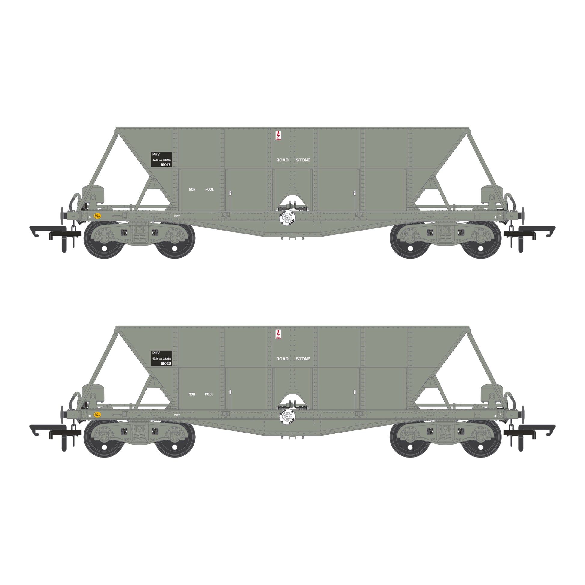 Detailed chassis and bogies, with separate vacuum brake gear, vacuum hoses, hopper door controls, handbrake wheels and brake gear.